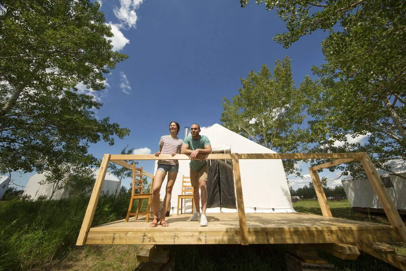 For a glamping or traditional camping stay, choose from Trapper’s Tents, tent sites, or powered and non-powered RV sites along the historic river lots. Enjoy conveniences like flush toilets, picnic tables, fire pits, and communal showers. Perfect for evenings by the fire, sleeping under prairie skies, and waking to peaceful valley views.Trapper’s Tent Features: