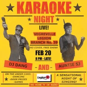Get ready for a night of the sound and the fury at the Vegreville Legion! This night of live karaoke features DJ Dang and Auntie SJ for some dancing, door prizes, games, and of course a sensational night of singing! This is a free, no-cover show! Date: February 20, 2026 Location: Vegreville Legion Time: 8 pm Vegreville Legion | Facebook