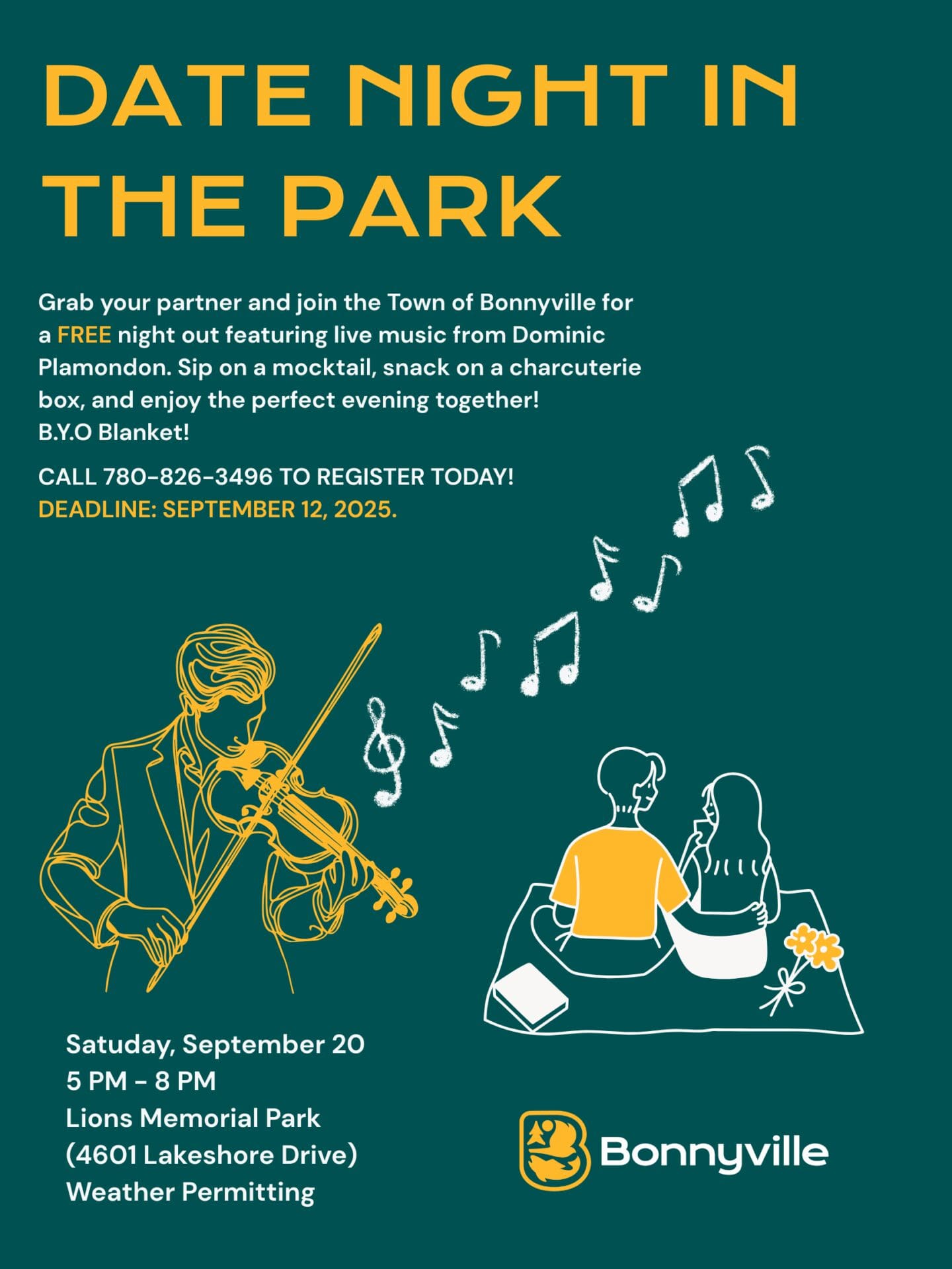 The Town of Bonnyville invites you to a relaxing and romantic evening by the water at Jessie Lake on Saturday, September 20, from 5:00 p.m. to 8:00 p.m. This free community event offers a peaceful setting to enjoy live music, light refreshments, and the natural beauty of the lake at sunset.
