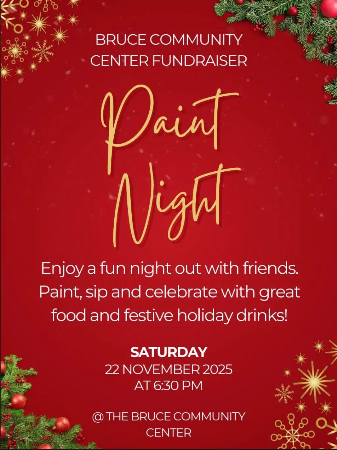 Visit the Bruce Paint Night at the Bruce Community Center Fundraiser. Enjoy a fun night out with friends. Paint, sip, and celebrate with great food and festive holiday drinks!