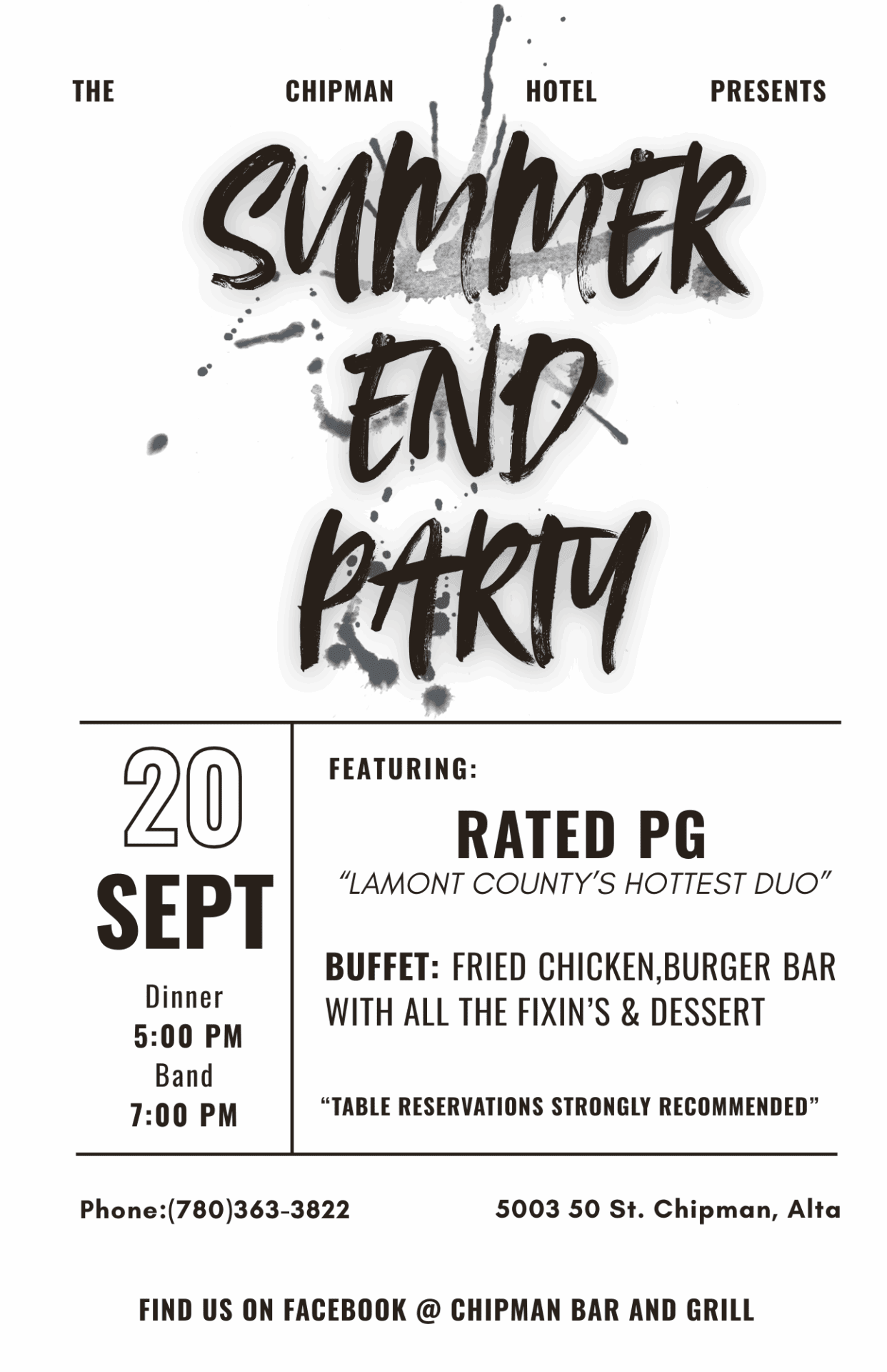 Chipman Hotel Summer End Party Fried Chicken and Burger Bar Buffet @ 5pm! LIVE music at 7pm! Table Reservations : (780)363-3822 + Add to Google Calendar + iCal / Outlook export Date Sep 20 2025 Expired! Time 5:00 pm Location Chipman Chipman Category East of EdmontonHighway 15 Share this event 2025 Go East of Edmonton Travel Guide