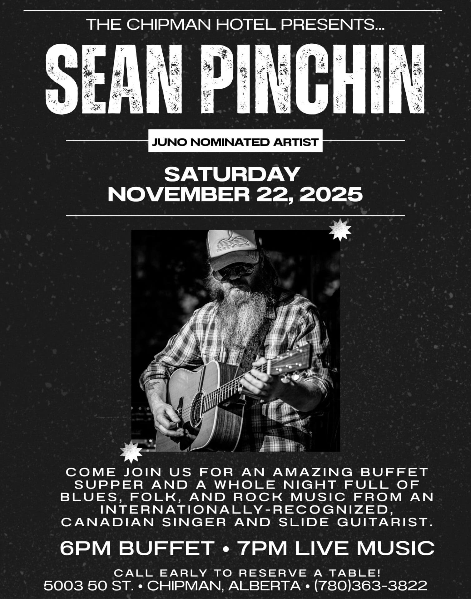 Come join us in Chipman, AB for an amazing buffet supper at 6PM and starting at 7PM,a whole night full of blues, folk, and rock music from an internationally-recognized, Canadian singer and slide guitarist: Sean Pinchin. Booking a table in advance is strongly recommended! Call us at (780)363-3822.