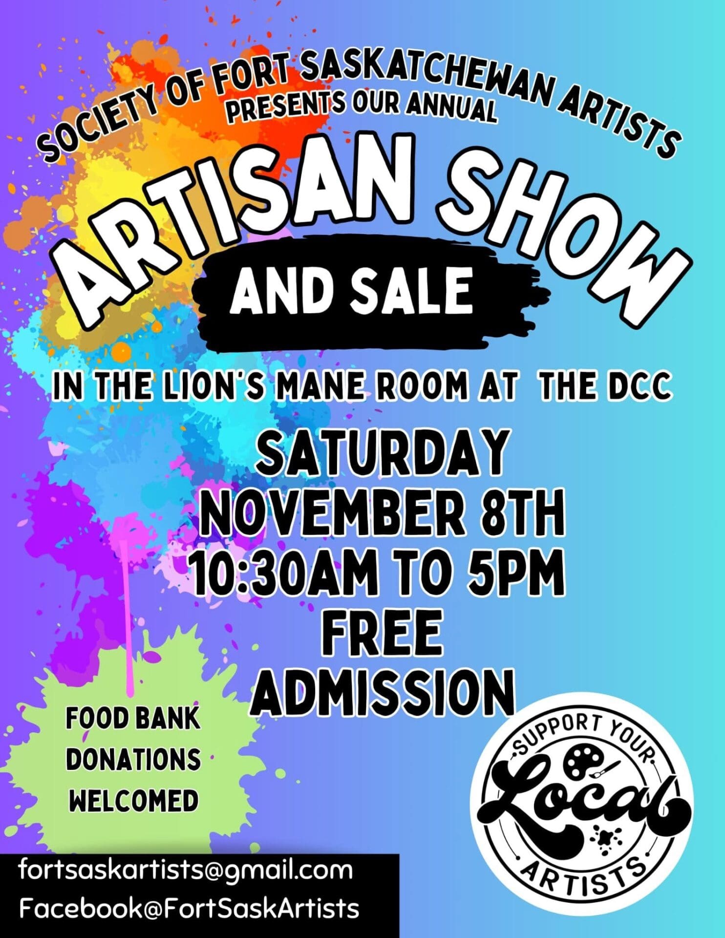 The society of Fort Saskatchewan Artists presents their annual Artisan Show and Sale! Held at the Lion’s Mane Room at the DCC on November 8th from 10:30 am to 5 pm with free admission.