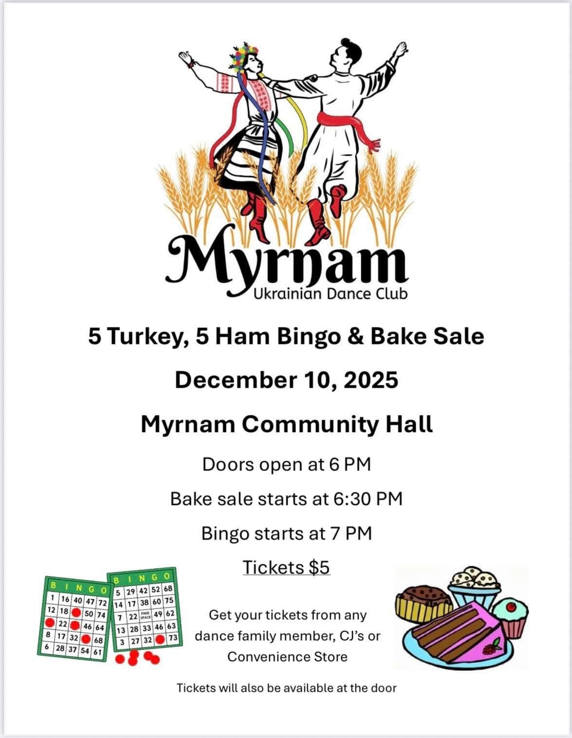 Join the Myrnam Ukrainian Dance Club for a 5 Turkey, 5 Ham Bingo and Bake Sale! Held at the Myrnam Community Hall, doors open at 6 pm!