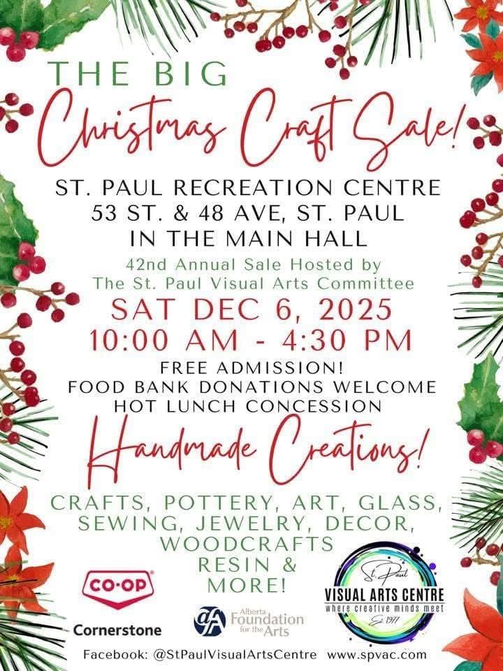St. Paul The Big Christmas Craft Sale Shop from various vendors at the St. Paul Recreation Centre! Held on December 6th from 10 am to 4:30 pm, featuring free admission, handmade creations and a hot lunch! + Add to Google Calendar + iCal / Outlook export Date Dec 06 2025 Time 10:00 am - 4:30 pm Location St. Paul, AB Category ChristmasHighway 28Northeast of EdmontonShopping Share this event 2025 Go East of Edmonton Travel Guide