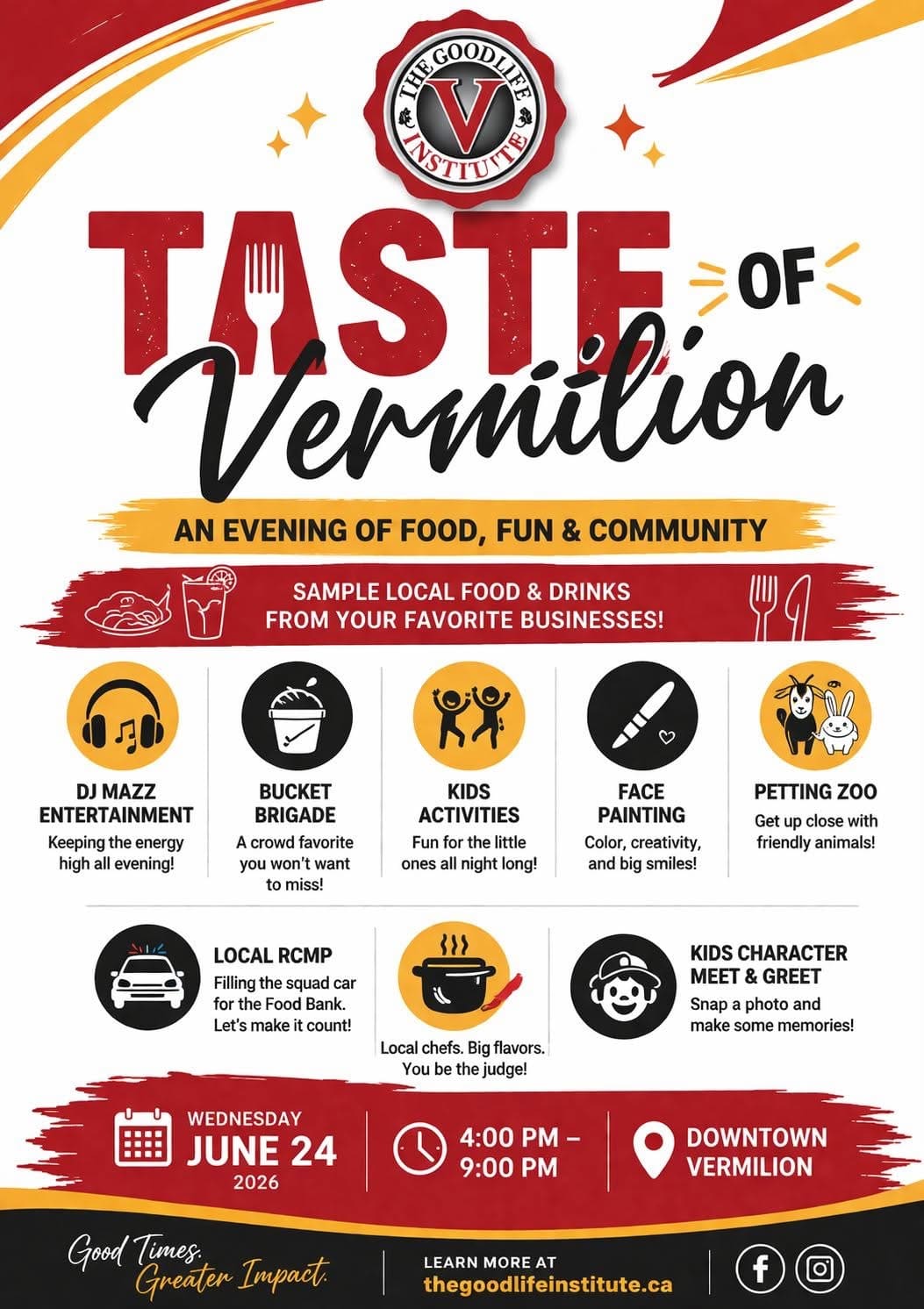 Enjoy a day filled with delicious food in Vermilion on June 24, 2026! Sample local food and drinks from your favourite businesses!