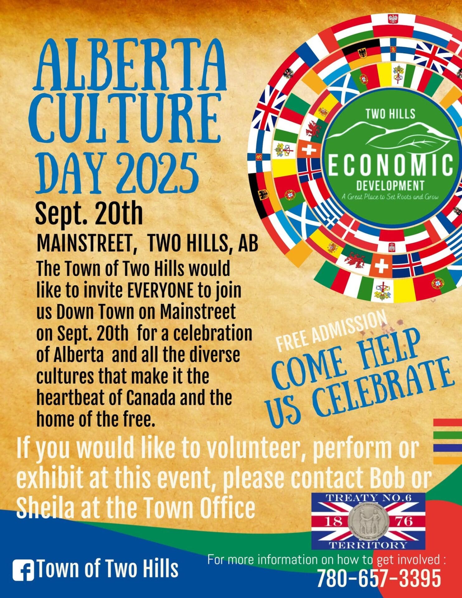 The Town of Two Hills would like to invite everyone to join us downtown on Main Street on September 20th for a celebration of Alberta and all the diverse cultures that make it the heartbeat of Canada and the home of the free!