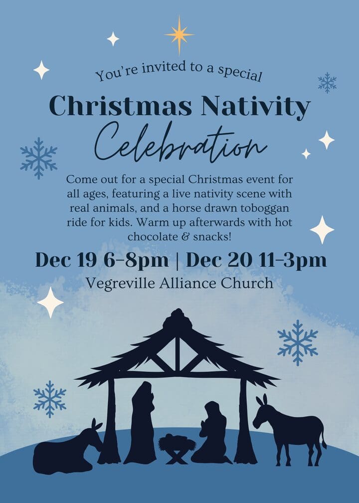 Vegreville Alliance Church is excited to be bringing a brand new Christmas event to Vegreville this year and would love to invite the whole community to come be part of it! This event is for everyone of all ages, whether you attend church regularly, sometimes, or not at all.