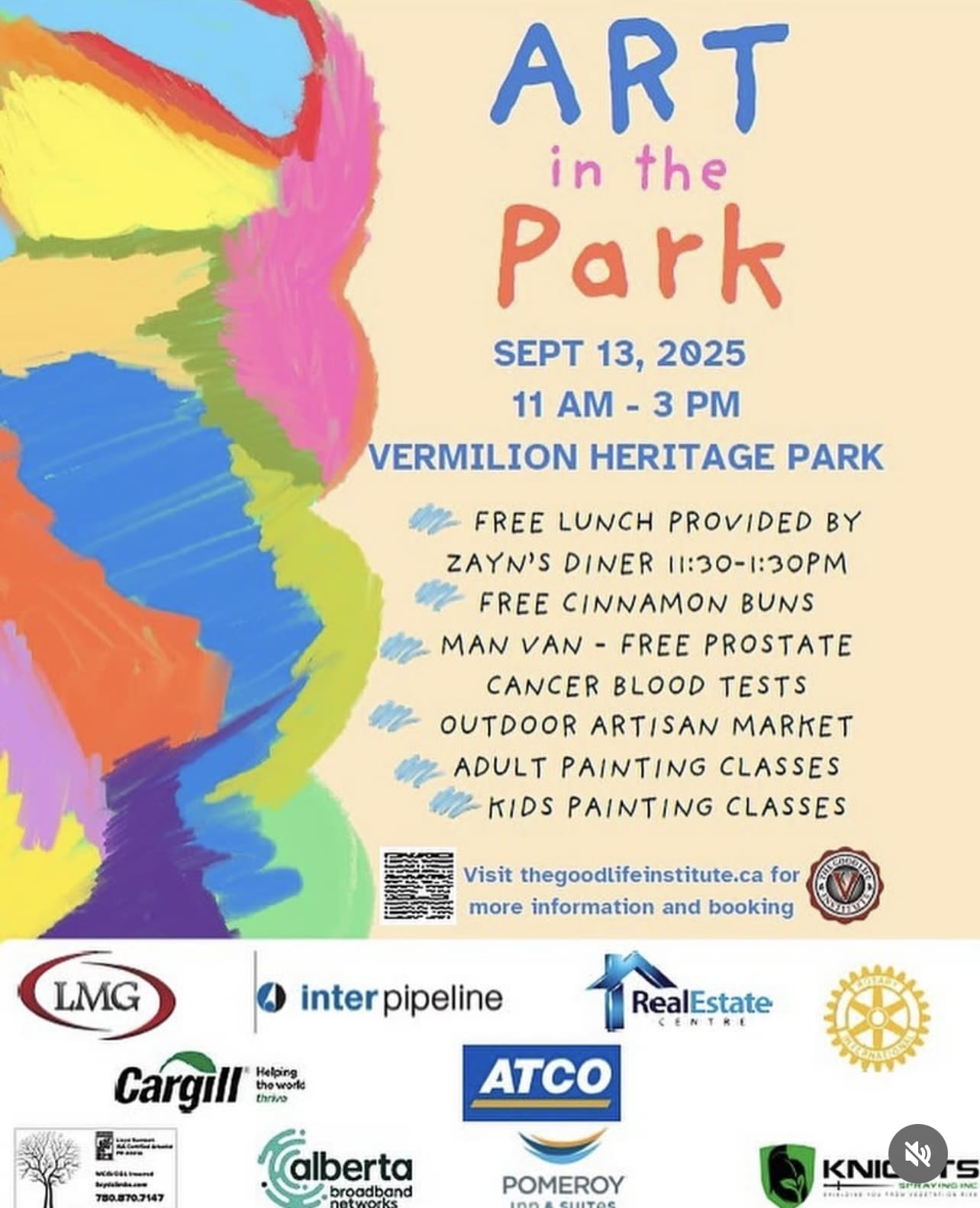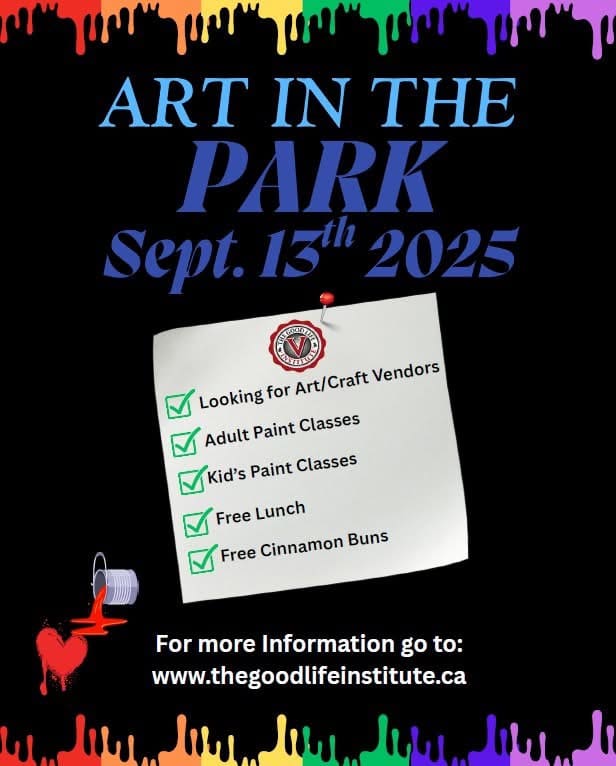 Make sure to save the date for Art in the Park on September 13! For more details of the day’s events, including an outdoor artisan market, art creation classes, and the man van, check out our website at www.TheGoodLifeInstitute.ca