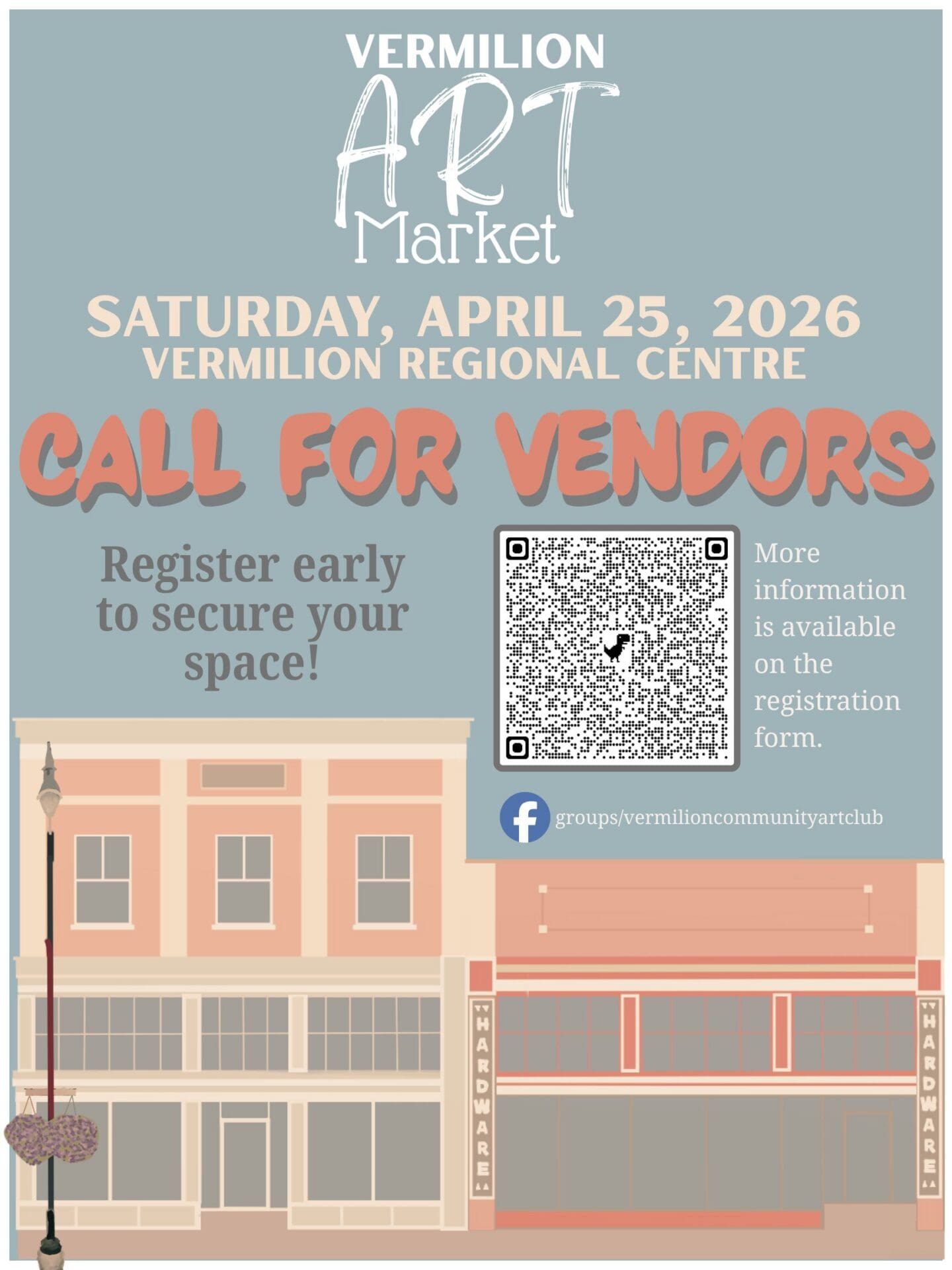 Vermilion Art Market Call for Vendors Register early to secure your space! + Add to Google Calendar + iCal / Outlook export Date Apr 25 2026 Time 10:00 am - 4:00 pm Location Vermilion Regional Centre 5702 College Drive, Vermilion, Alberta Category Arts & Performing ArtsCommunityEast of EdmontonHighway 16Shopping Organizer Vermilion Community Art Club Website https://www.facebook.com/groups/vermilioncommunityartclub Share this event 2026 Go East of Edmonton Travel Guide coming soon!