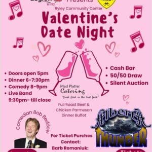 Celebrate Valentine’s Day in Ryley with a delicious platter of food, cash bar, 50/50 draw, and a silent auction. Date: February 14, 2026 Cost: $50 Time: Doors open at 5 pm Contact: 780-275-1234, 519-671-3511 Location: Ryley Community Centre