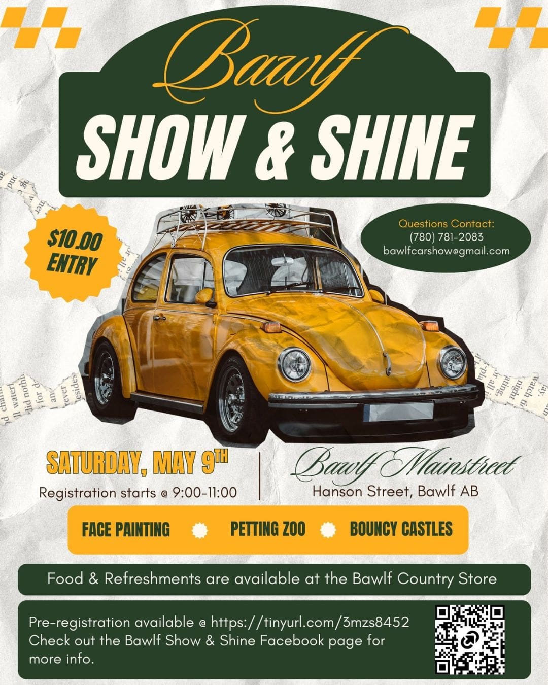 Rev up your engines for the annual Village of Bawlf Show & Shine on May 9th! Registration runs from 9:00–11:00 a.m. for $10 per show vehicle, with the show cruising all day long. Come check out an impressive lineup of classic cars, trucks, motorcycles, and tractors — polished, powerful, and ready to turn heads. It’s not just for motorheads. Bring the whole family and enjoy face painting, inflatable fun, a petting zoo, and a local market. There’s something for everyone, ...
