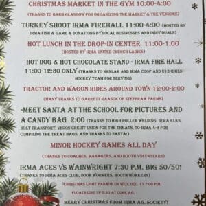 Celebrate Christmas at the Irma Santa Day, with a market, wagon rides, food, hockey, and much more! Held at various locations across the town on December 13th! There is also a Christmas Parade, you don’t want to miss! Location: Irma, Alberta (Various Locations) Time: 10 am to 7:30 pm Cost: Free For more information, contact the Irma Ag Society or visit their Facebook page below. Irma Agricultural Society | Irma AB | Facebook