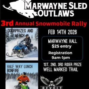 Gather in Marwayne on February 14th for the third annual Snowmobile Rally! Featuring lunch, door prizes, and cash rider prizes! Snowmobile Rally Date: February 14, 2026 Time: 9 am to 1 pm Registration Cost: $25 Entry Contact: 306-817-0253