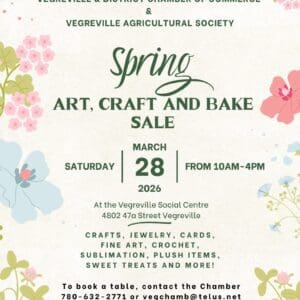Come by the Vegreville Social Centre on March 28, 2026, for the Vegreville Spring Arts, Crafts, and Bake Sale! From 10 am to 4 pm, you can browse and shop a variety of fine art, handmade crafts, jewelry, crochet items, baked goodies, and more! Date: March 28, 2026 Location: 4802 47a, Vegreville Social Centre Time: 10am – 4pm