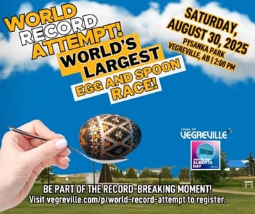 On August 30th head down to Vegreville for their largest egg and spoon race world record attempt! Held in conjunction with Alberta Day this is a record-breaking event you won’t want to miss! Register today for this Amazing event!